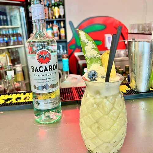 Côco Loco (Rum branco, rum anejo, lima, vodka, sumo de ananás, calda de côco, banana e açúcar)7,50€